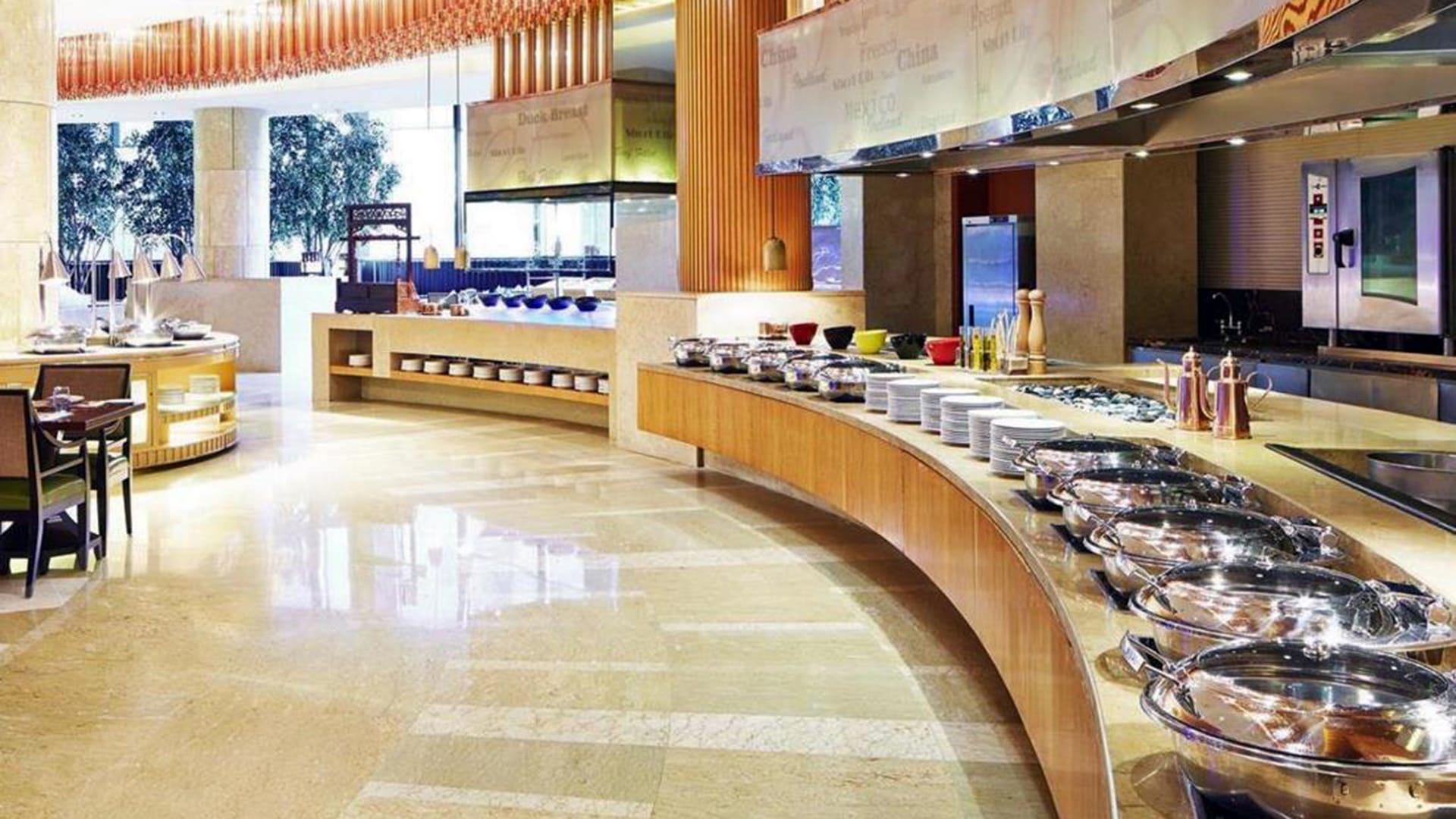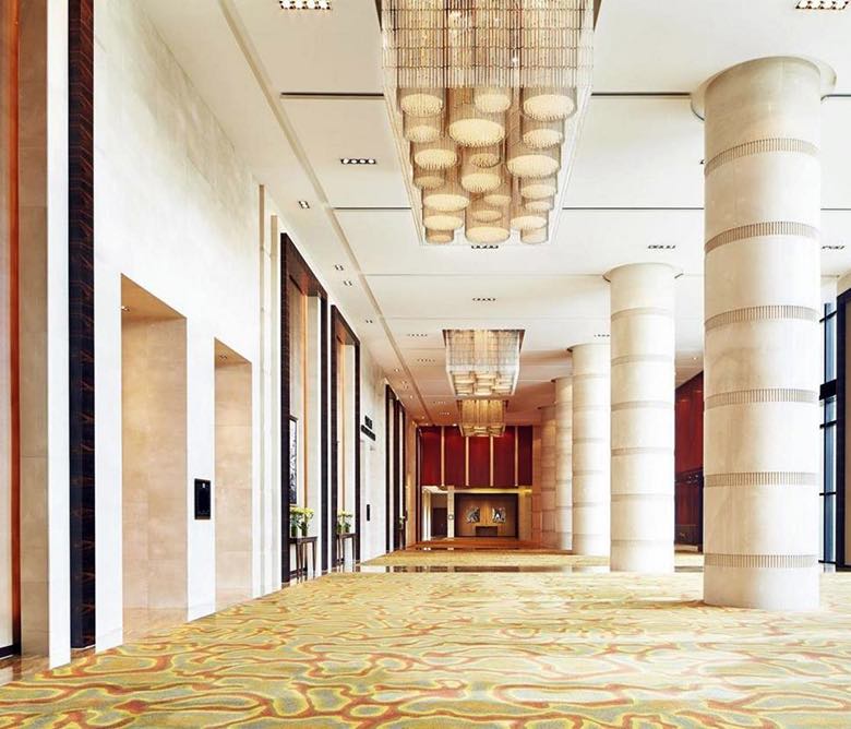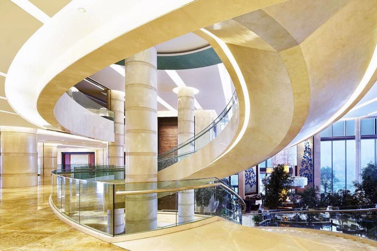Description: Ubicado en Jinan, China, hemos decorado este hotel Sheraton de alta gama con materiales de nuestro país de origen, España. Amarillo Triana fue utilizado en los baños y Crema Real en los interiores del hotel, específicamente en sus columnas grandiosas.