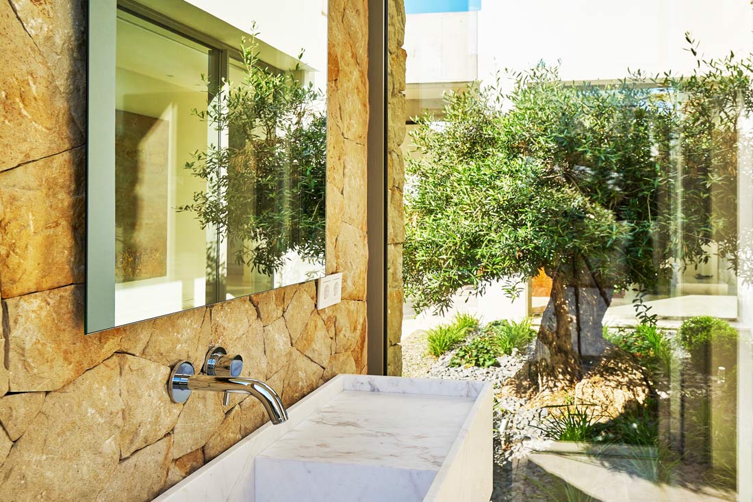 Esta bonita villa, además de tener la fachada ventilada en travertino, también presenta suelos de travertino en exteriores.