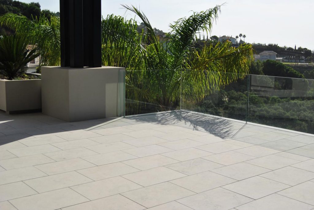 El material utilizado para la confección del suelo de esta magnífica terraza se llama Twilight Grey y es una piedra caliza de tonos humo y muy homogénea. Una de sus particularidades estéticas es que cuando se le aplica el acabado apomazado (mate) guarda un espectacular parecido con el cemento. Sin embargo, este material además cuenta con las características únicas e inimitables de la piedra natural.